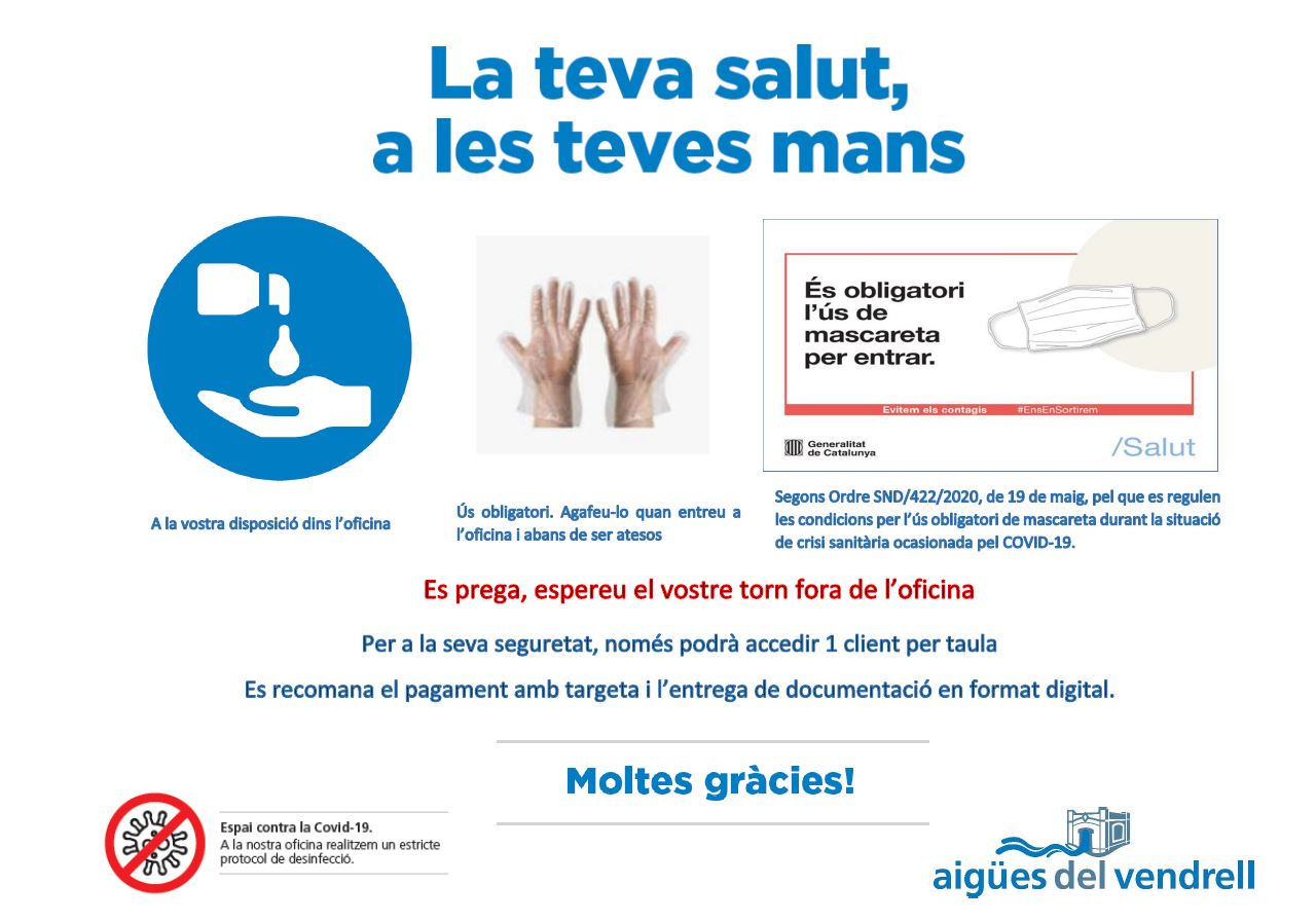 aigües del vendrell continua implemenant un pla de contingència amb l'objectiu de limitar i minimitzar l'impacte generat per la crisi del coronavirus en la seva activitat, garantir la continuïtat dels serveis i protegir tant als seus empleats com als usuaris.