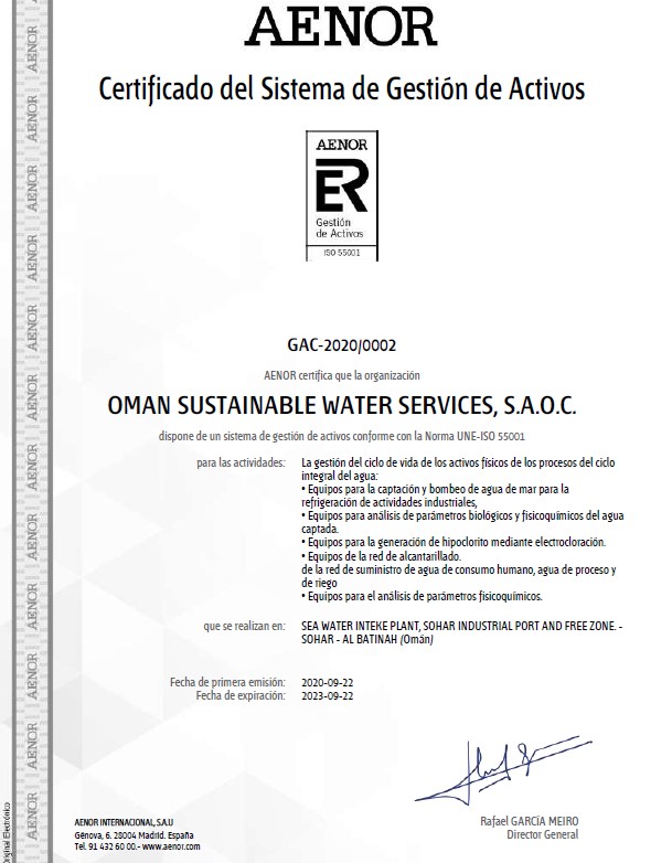 OSWS (Oman Sustainable Water Services SAOC), the consortium formed by Aqualia and the company Majis for the management of the water infrastructure of the harbour of Sohar (Oman), has just obtained the AENOR ISO 55001 asset management certification. This is the first certification that Aqualia has obtained in this area and also the first that AENOR has issued in the field of asset management for a company based in Oman, which, in the words of the certifying organization, "demonstrates the strategic focus on internationalization in the provision of our services".
